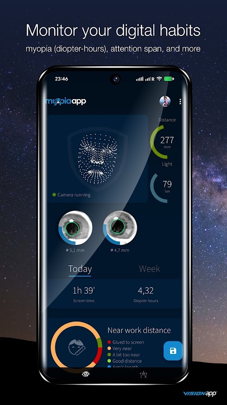 🔬 Số giờ diopter — tổng lượng công việc nhìn gần tác động lên mắt, chỉ số mà các nhà khoa học về thị giác liên kết với sự tiến triển của cận thị. Cuối cùng đã có thể đo lường được. Cuối cùng là của bạn.
