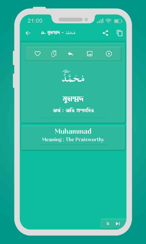 Trong tiếng Ả Rập, những cái tên cao quý này được gọi là “Asma ul Nabi” có nghĩa là tên của Nhà tiên tri. Ứng dụng này sẽ hiển thị 99 tên của Muhammad với ý nghĩa ở dạng đồ họa trong khi tên cũng có thể được nghe trong một bài đọc hay.