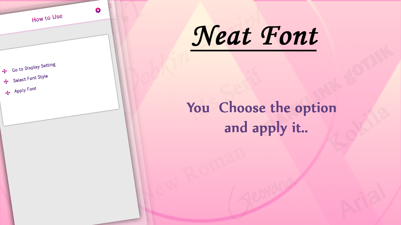 Use our smart Neat Font Free Style application which is allows users to get one or more Font Style in your mobile for free. Application which allows users to see instant preview about fonts and then apply on device. Quick settings to change your font directly fast within some seconds. Get Neat Fonts with Large collection and best way to change the stylish look to Android Phone with attractive Fonts.