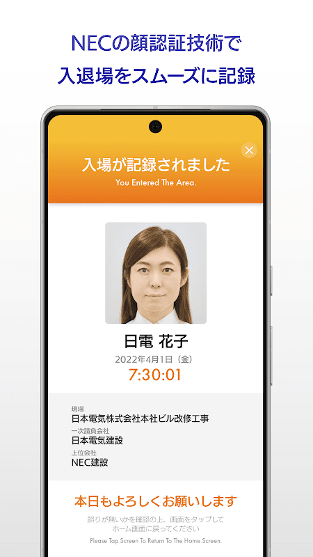 Đây là dịch vụ hỗ trợ nhận diện khuôn mặt tại công trường bằng cách liên kết với hồ sơ ra/vào (dịch vụ liên kết GPS) do Tập đoàn NEC cung cấp.