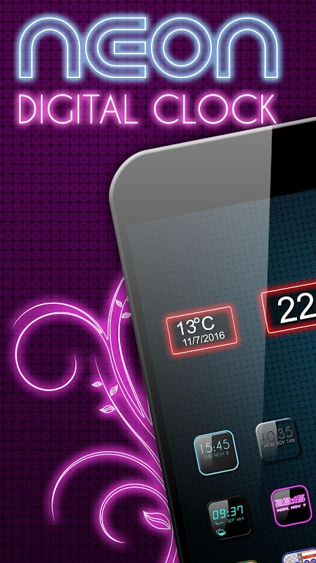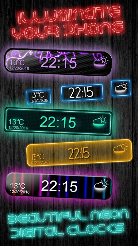 Vibrant tones and shades of violet and purple will beautify your mobile phone! The digital functions in this time and date and weather app for your smartphones are magnificent! Enjoy the neon nights with this free app because it has an exciting big digital clock showing when screen off! Our neon clock widget will match perfectly with your neon keyboard themes! This digital watch with seconds will let you enjoy every second, minute and hour of each and every day! Customize your smart devices with some spectacular led clock functions! It's sensational! It's funky and interesting like any date and time app you already like! It's rich in colors and it shines brighter than the Sun! Calling for all the gadget nerds to get this good timer as soon as possible! Inspire yourself with your favorite design, just like with abstract wallpaper of your choice! Choose your favorite brilliant hue color! Make your mobile phones and tablet devices flashy – not plain! Illuminate your homescreens with magical hues of green, yellow, pink or blue! Hurry up! The app of the day is waiting for you!