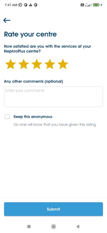 NephroPlus Khách có thể sử dụng ứng dụng này để quản lý sức khỏe của mình một cách chủ động hơn nhiều. Ứng dụng này đặt toàn bộ thông tin liên quan đến sức khỏe của bạn trong tầm tay của bạn. Truy cập kết quả xét nghiệm trong phòng thí nghiệm hoặc đơn thuốc của bạn, đặt trước các thời điểm Phiên chạy thận, tham khảo ý kiến của bác sĩ thận học hoặc chuyên gia dinh dưỡng và thậm chí thanh toán cho các phiên của bạn để bạn không cần phải mang theo tiền mặt hoặc thẻ tín dụng đến Trung tâm Lọc máu.