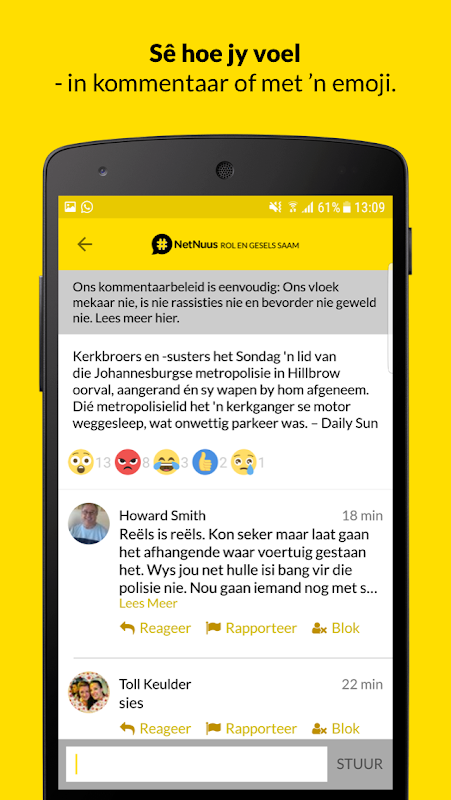 NetNuus is ‘n gratis, Afrikaanse nuus-app wat jou in 'n japtrap op hoogte bring van die jongste nuus waaroor almal praat. Die app is gemaak vir die van ons wat nuus vinnig wil lees, niks wil mis nie en nie verlore raak nie. Dis nuus wat saak maak: raakgevat. Wanneer iemand jou vra: "Het jy gehoor?"... het jy dit waarskynlik reeds op NetNuus gelees. Die app bied ‘n gerieflike leeservaring – wat ons die gewildste Afrikaanse nuus app in Suid-Afrika gemaak het. Het jy iets op die hart? Wat dink jy oor wat in die nuus gebeur? Sê jou sê of reageer met ‘n gesiggie – maak soos jy smaak. Met regstreekse kennisgewings (“push notifications”) verseker die app dat jy geen stories misloop nie. Dis rolnuus vir almal.