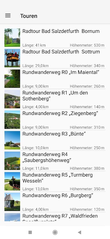 Trong menu chính, bạn sẽ tìm thấy danh sách các điểm ưa thích được sắp xếp theo khoảng cách từ vị trí hiện tại của bạn. Một chuyến tham quan được liên kết với hầu hết các điểm tham quan, bạn có thể gọi lên trong chế độ xem chi tiết của điểm thông tin qua biểu tượng chuyến tham quan. Sau khi gọi điện cho chuyến tham quan, khóa học sẽ hiển thị trên bản đồ và chuyến đi bộ hoặc đi xe đạp có thể bắt đầu. Vị trí của bạn liên tục được theo dõi trên bản đồ. Khoảng cách đến đích được hiển thị bằng cách hiển thị số km còn lại ở đầu màn hình. Ví dụ: nếu bạn rời khỏi tuyến đường do rẽ nhầm, âm thanh cảnh báo sẽ phát ra. Đến đích an toàn và thư thái không có vấn đề gì.