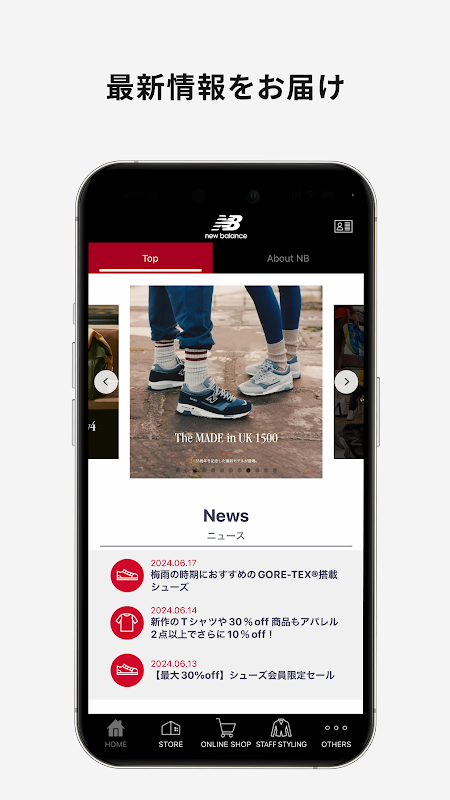 Ứng dụng cửa hàng chính thức của New Balance cung cấp nhiều nội dung hữu ích giúp trải nghiệm mua sắm của bạn trở nên thú vị hơn, từ thông tin mới nhất đến các chiến dịch và điều kiện tìm kiếm cửa hàng thuận tiện.