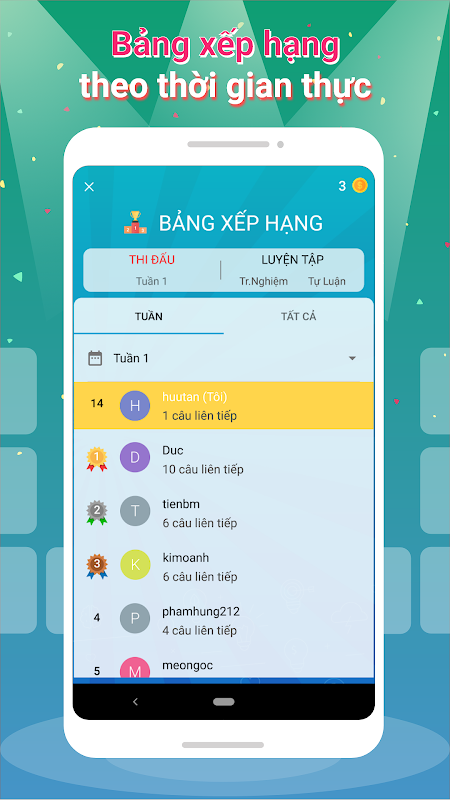 ⚡ Thi đấu hàng tuần ⚡Mỗi tuần sẽ có bộ câu hỏi mới, người chơi sẽ phải tự suy nghĩ và điền đáp án đúng. Sẽ có 2 phút để hoàn thành bộ câu hỏi, điểm số được tính là số câu trả lời đúng liên tiếp. Người chơi đứng đầu mỗi tuần sẽ nhận được giải thưởng tiền mặt.