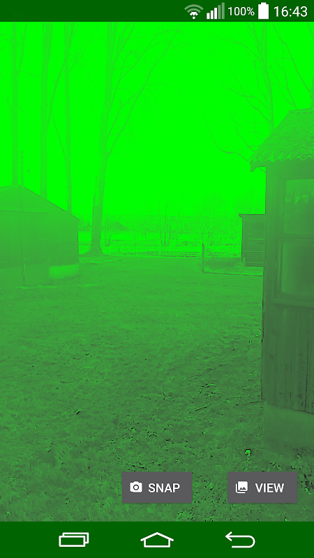 Take photos using a night vision/camera effect! The app brightens up the darker parts of the picture and uses a green effect. You can take pictures by pressing the snap button and view them afterwards.