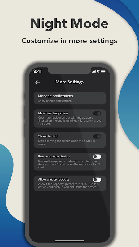 Chế độ ban đêm - ứng dụng tiết kiệm pin và mắt giúp màn hình thiết bị của bạn thích ứng với thời gian ánh sáng ban ngày và nó lọc luồng ánh sáng xanh do các thiết bị thông minh của bạn phát ra sau khi mặt trời lặn và bảo vệ đôi mắt của bạn bằng bộ lọc màu đỏ dịu và dễ chịu.