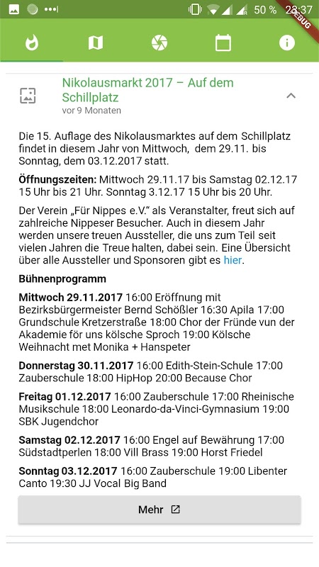 Auch bietet die App Übersichten über Veranstaltungen in Nippes und Neues aus dem Verein.