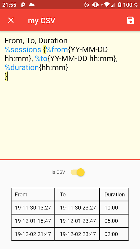 - Exporting via e-mail as .csv, or a custom text format that you can write yourself in the app