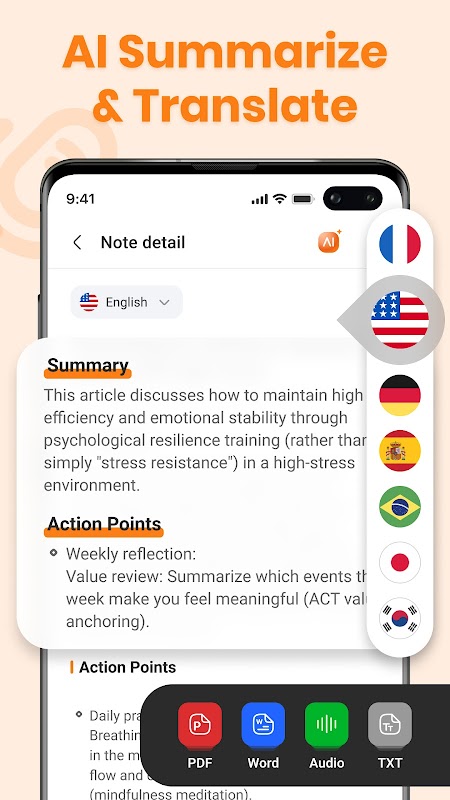 Tải lên tệp âm thanh, PDF, Word hoặc TXT, AI sẽ tự động phân tích nội dung để tạo tóm tắt, các điểm chính và danh sách việc cần làm chỉ bằng một cú nhấp chuột.