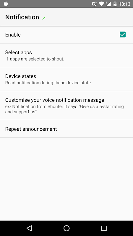 Thông báo bằng giọng nói thực hiện khá nhiều những gì tên ứng dụng nói. Nó đọc các thông báo của bạn cho bạn để bạn không phải tự đọc chúng và nó đi kèm với một số tính năng khác như thông báo tên người gọi, đọc tin nhắn, thông báo trạng thái pin, thông báo vị trí gần. Nó đi kèm với rất nhiều tùy chọn tùy biến.