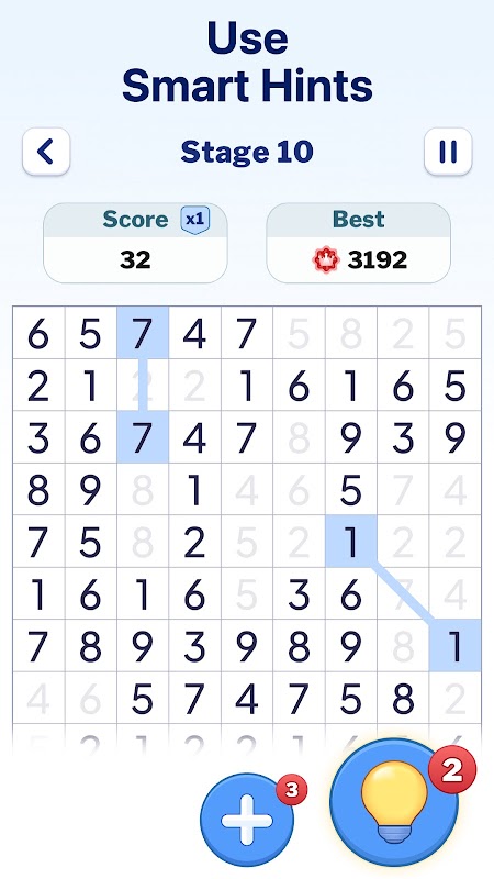 Sử dụng gợi ý và tăng cường để vượt qua các thử thách khó khăn và giữ cho chuỗi trò chơi số của bạn sống động.