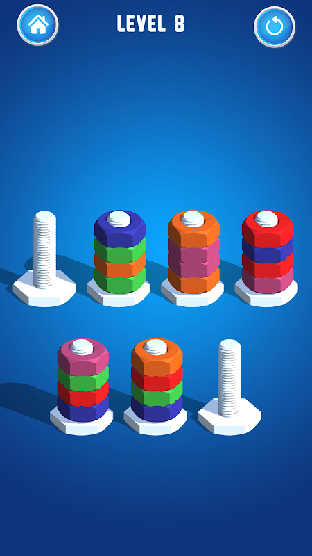Sắp xếp các đai ốc màu trên bu lông cho đến khi tất cả các màu được sắp xếp trên mỗi bu lông. Đây là một trò chơi đầy thử thách nhưng cực kỳ thỏa mãn. Hãy vui vẻ và giảm bớt căng thẳng của bạn cùng một lúc!