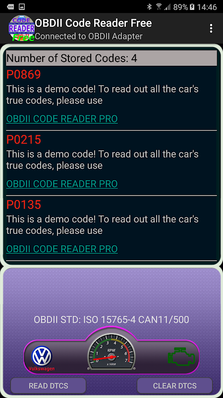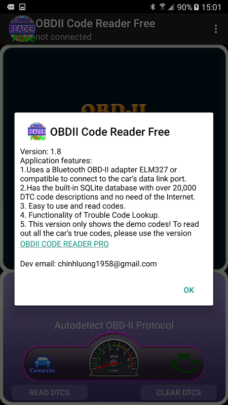 Hạn chế của phiên bản miễn phí của OBDII Code Reader Free là ứng dụng chỉ hiển thị các mã lỗi DTC demo. Để đọc mã lỗi DTC thực tế và dữ liệu cảm biến trực tiếp, vui lòng sử dụng phiên bản OBDII CODE READER PRO