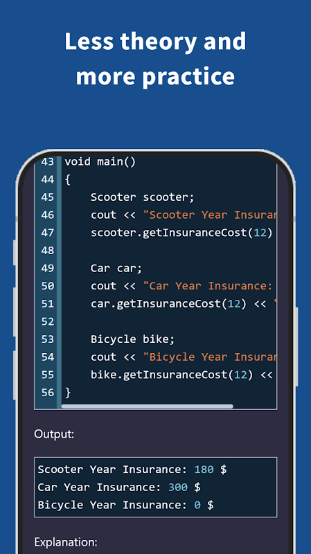 Học từ ứng dụng này sẽ giúp bạn hiểu các khái niệm lý thuyết cơ bản của OOP - Lập trình hướng đối tượng trong thời gian ngắn. Thông tin dễ hiểu để hành trình của bạn trở nên dễ dàng hơn.