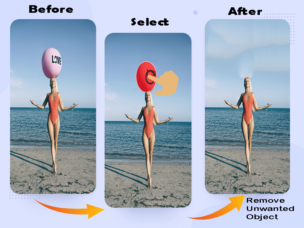 Một lần nhấn để xóa đối tượng không mong muốn một cách tự nhiên, logo, con người, văn bản, nhược điểm, nhãn dán, hình mờ… Xóa đối tượng - Chỉnh sửa ảnh chắc chắn là lựa chọn tối ưu của bạn. Hãy thử chế độ AI kỳ diệu để chọn và loại bỏ đối tượng không mong muốn trong vài giây với tính năng phát hiện AI.