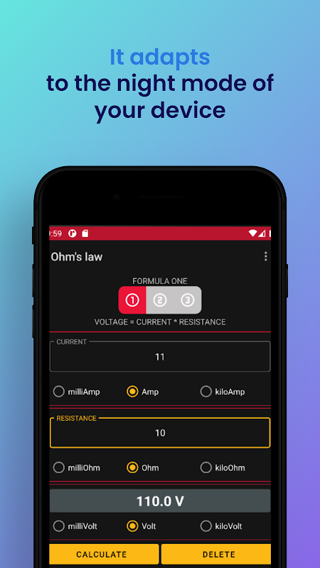 Máy tính chuyên nghiệp cho tất cả các phép tính luật ohm. Bao gồm 12 công thức toán học về điện áp, dòng điện, điện trở và công suất. Bạn có thể sửa đổi các đơn vị chuyển đổi. Nó cũng có các định nghĩa lý thuyết của từng thuật ngữ.