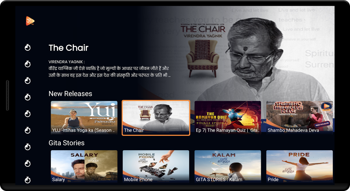 OM Tv là một nơi đã nỗ lực nắm bắt tất cả các khía cạnh có thể có của Sanatan Dharma, thông qua sức mạnh cốt lõi của nhóm là kể chuyện vì những câu chuyện là một phần không thể thiếu trong cội nguồn văn hóa của chúng tôi. Đó là một nỗ lực để làm cho công dân của đất nước này nhận thức được kiến thức khoa học, khoa học đằng sau các nghi lễ và phong tục, triết lý sâu sắc được nhúng trong mọi hành động thông qua các chương trình khác nhau. Nếu có những bộ phim và chương trình thần thoại thu hút trí tưởng tượng của người xem tại một thời điểm, thì có những cốm trí tuệ được những người lớn tuổi phổ biến trong các cuộc nói chuyện của họ, những người mà bản thân kinh nghiệm của họ đã khiến người ta phải kính trọng, trong chương trình được đặt tên một cách khéo léo - The Chair. Một mặt, nếu có một chương trình tranh luận về Aastha hoặc Andhvishwaas, thì sẽ có những mẩu thông tin nhỏ trong Gyaan Yaan. Mặc dù có nỗ lực làm say mê khán giả thông qua âm nhạc và bhajans, nhưng cũng có nỗ lực đưa triết lý trường tồn của Gita qua những câu chuyện đơn giản về cuộc sống hàng ngày.