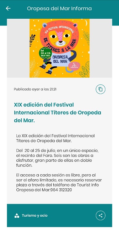 Nhờ ứng dụng này, bạn sẽ nhận được trên mặt điện thoại di động của bạn quan tâm chung mà các thành phố của Oropesa del Mar công bố.
