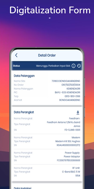 Ứng dụng One Stop Fulfillment Mobile là một ứng dụng nhằm số hóa quy trình trong lĩnh vực này dành cho các kỹ thuật viên & dịch giả tự do. Ứng dụng OSF này có một số tính năng như: chấp nhận công việc, biểu mẫu kỹ thuật số và đã được tích hợp với một số ứng dụng khác tại Telkomsat.