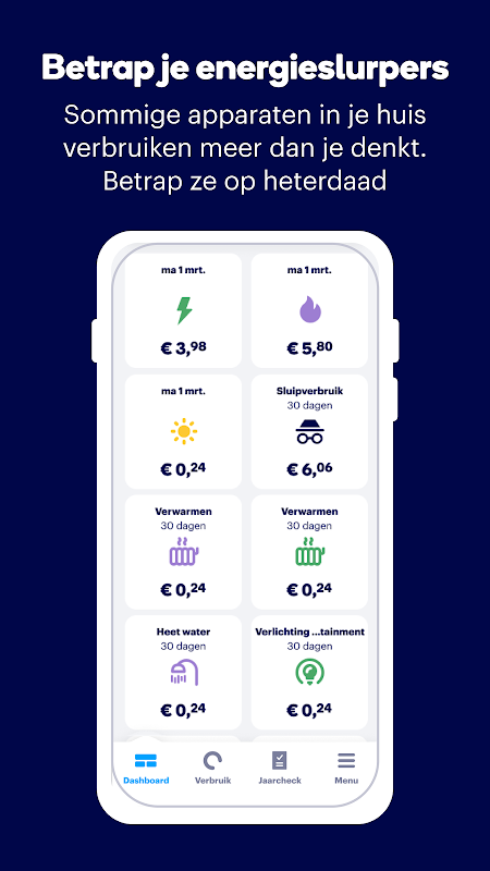 Trong ứng dụng, bạn có thể xem chính xác lượng điện và khí đốt mà bạn đang sử dụng. Nó chứa đầy những thông tin chi tiết thông minh, chẳng hạn như mức tiêu thụ mỗi ngày hoặc thậm chí theo từng loại thiết bị. Điều đó sẽ giúp bạn bắt được những con mồi năng lượng. Và làm cho việc tiết kiệm dễ dàng hơn rất nhiều.