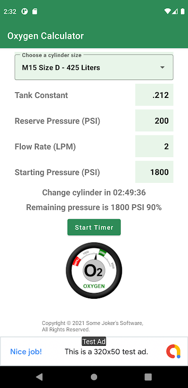 Oxygen Calculator sẽ tính lượng oxy còn lại trong bình oxy dựa trên kích thước và áp suất còn lại trong PSI. Ngoài ra, một bộ hẹn giờ / báo thức có thể được đặt để cảnh báo cho bạn khi bạn đạt đến lượng oxy dự trữ còn lại.