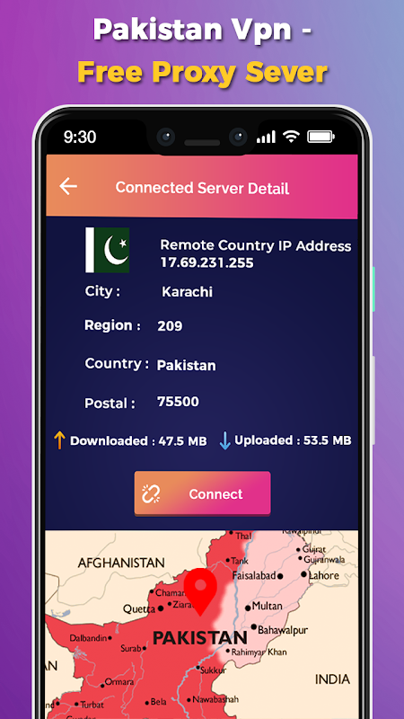 browsing with Pakistan Vpn-Free Proxy Sever is the fastest network of any Pakistan country. Find all latest information like news, videos and many more sites related to Pakistan country. An application can particularly design considering the Intuitive User Interface while using it. your device and network are safe to use while you using or connected with any servers.