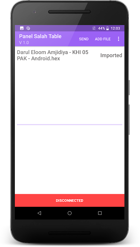 Sử dụng ứng dụng này, người dùng có thể gửi tệp Hex của Bảng Salah tới Bảng đồng hồ Salat với sự trợ giúp của kết nối Bluetooth.