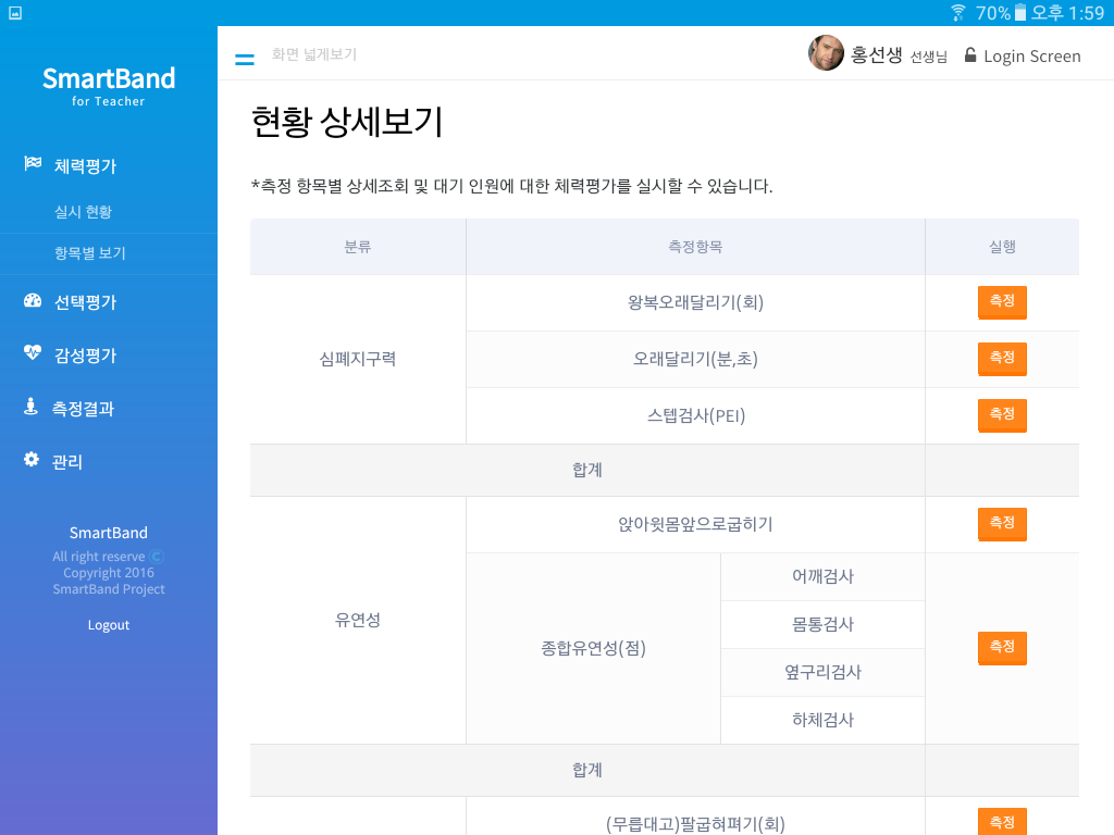 PAPS 체력 측정 시스템을 웹 형태로 제공하고 스마트밴드와의 통신으로 손쉽게 심박수를 얻을 수 있습니다.