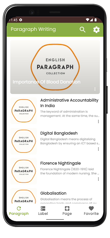 Bạn có nhầm lẫn về Viết đoạn văn trong bài thi tiếng Anh của mình không? Bạn đau đầu về chủ đề Đoạn văn? Sau đó, bạn đang sử dụng ứng dụng phù hợp. Trong ứng dụng này, chúng tôi đang đề cập đến các Đoạn tiếng Anh phổ biến nhất. Đây là danh sách các đoạn văn của chúng tôi -