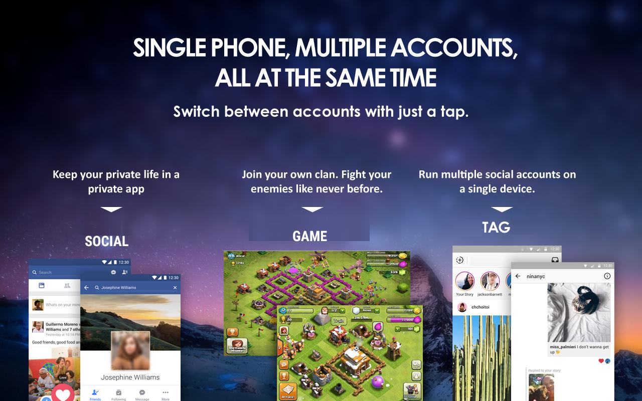 & # 8226; & # 8195; điện thoại sim kép với một tài khoản truyền thông xã hội không? Không nữa. Chỉ cần cài đặt ứng dụng trong tài khoản song song và điều trị cho mình với một tài khoản thứ hai, ảo.