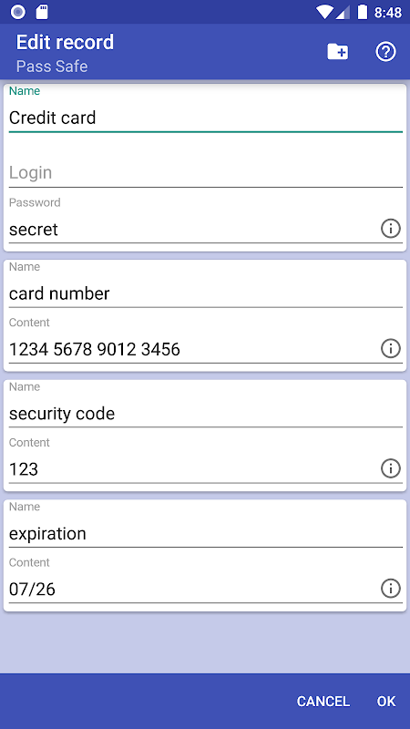 Gặp khó khăn để nhớ tất cả mật khẩu, tên người dùng, tài khoản, số tài khoản, id khách hàng, mã bảo mật, mã định danh, ghim của bạn? Pass Safe có thể được sử dụng để lưu trữ tất cả mật khẩu, tên người dùng, tài khoản của bạn, v.v ... Tất cả những gì bạn cần biết để có quyền truy cập là một mật khẩu chính. Dữ liệu của bạn được lưu trữ được mã hóa (chỉ sử dụng AES-256 cypher) trên thiết bị của bạn.