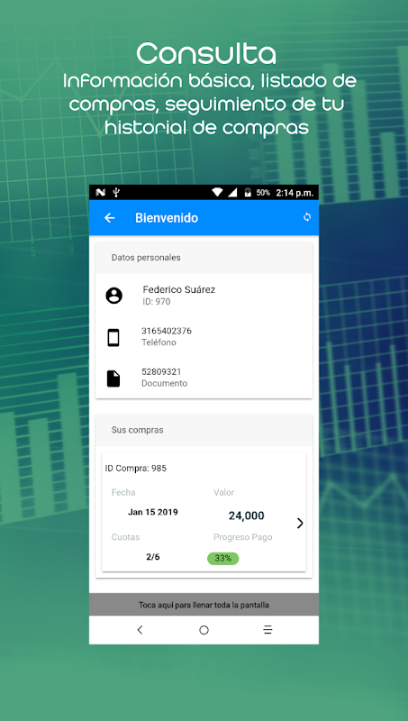 Permite consultar en tiempo real todas las transacciones financieras que realizas con nosotros, consulta tu información conoce el detalle de tu compra, cuotas pendientes, porcentaje de pago, historial de tus compras con nuestra app.