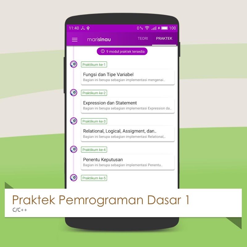 Pemrograman Dasar membahas dasar pemrograman menggunakan bahasa C/C++. Dengan menggunakan aplikasi ini, pengguna tidak perlu repot membawa buku kemanapun berada. Cukup menggunakan perangkat android saja pengguna dapat mempelajari pemrograman dasar bahasa C/C++.