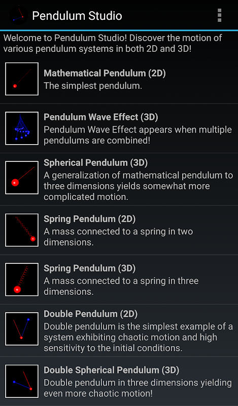 Mô phỏng chuyển động của chín hệ thống con lắc khác nhau trong thời gian thực trên điện thoại của bạn.