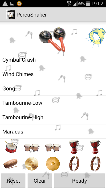 Instruments you can play with this app: Snare Drum, Bongos, Cabasa, Castanet, Conga, Cowbell, Guiro, Ride Cymbal, Crash Cymbal, Wind Chimes, Gong, Tambourine, Maracas, and Triangle.