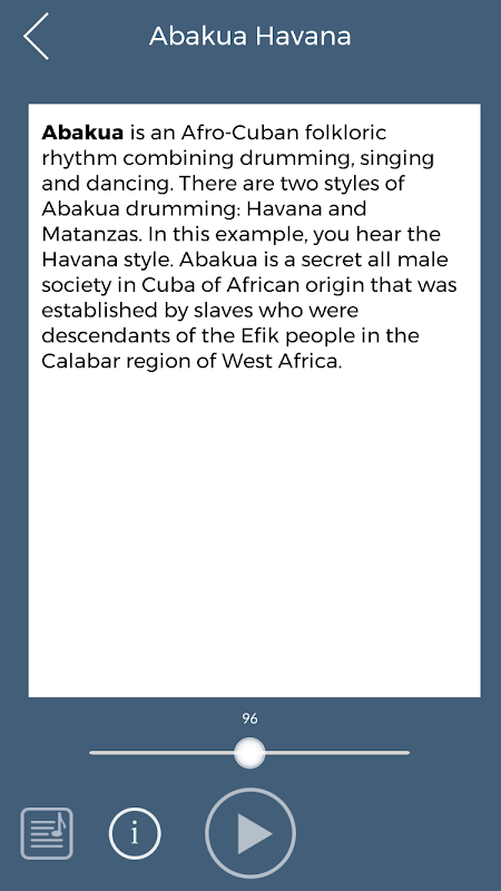 Ứng dụng này đặt bạn trong một tình huống chơi live - giống như bạn đã học ngôn ngữ mẹ của bạn. Bạn sẽ âm thanh tự nhiên hơn và sống động hơn và bạn sẽ đánh thức những khả năng nhịp điệu mới. Nó cũng là một công cụ tuyệt vời cho các nhạc sĩ khác, vũ công và diễn viên người muốn đắm mình vào ngôn ngữ truyền thống hàng trăm năm tuổi.