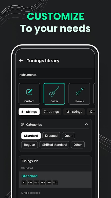 - điều chỉnh tùy chỉnh - chọn âm thanh (nốt nhạc) cho guitar, cho violin và hơn thế nữa