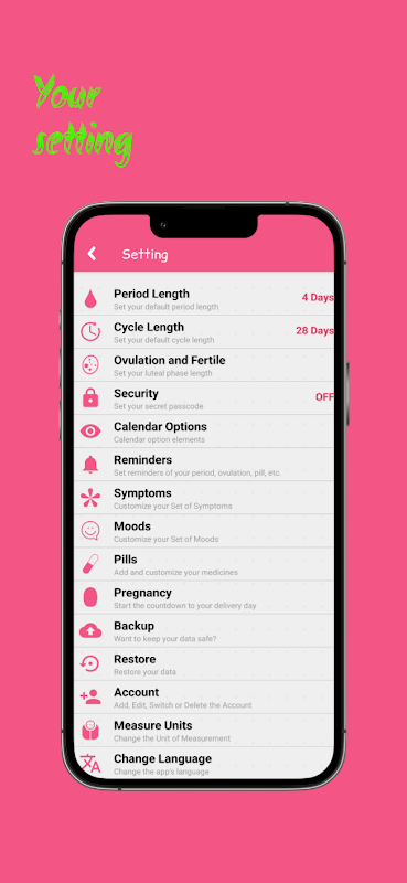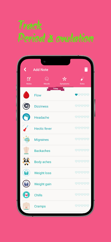 Theo dõi chu kỳ bất thường, cân nặng, nhiệt độ, tâm trạng, lưu lượng máu, triệu chứng PMS, chất nhầy, cân nặng, BMI, nhiệt độ cơ bản, thử rụng trứng, thử thai, vòng eo hông, huyết áp, v.v. Kiểm soát hoàn toàn sức khỏe của bạn!