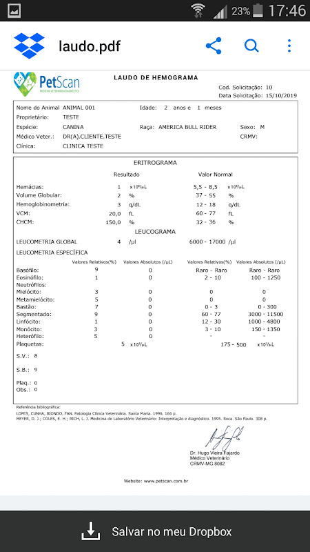 - Solicitação online de Exames Laboratoriais, bastando informar os dados do Animal ou selecionando um Animal já cadastrado, o nome do Proprietário, os Exames desejados e a Identificação dos Materiais de Amostra a serem enviados para o Laboratório;