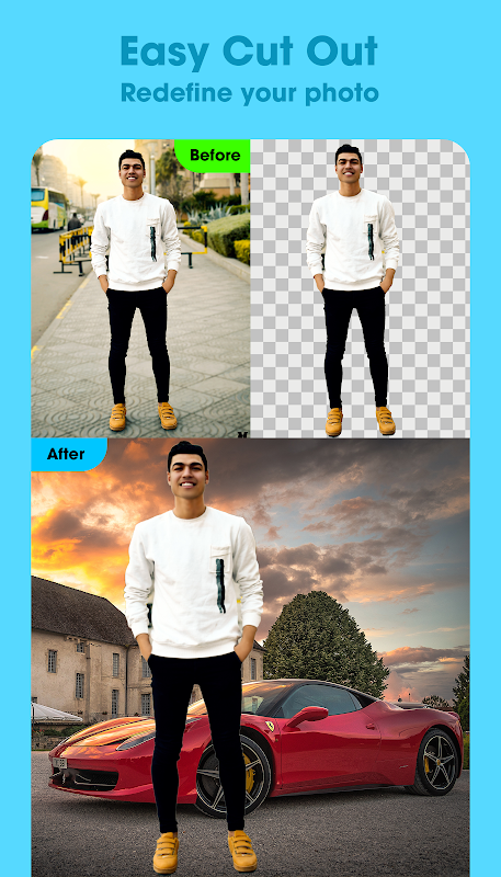 Simple cut out your photo and insert all new beautiful HD backgrounds. This app has simple and easy way to create cut out your photo with new background. Erase the background area of the picture by your finger touch then insert new available background or choose photo from your gallery.