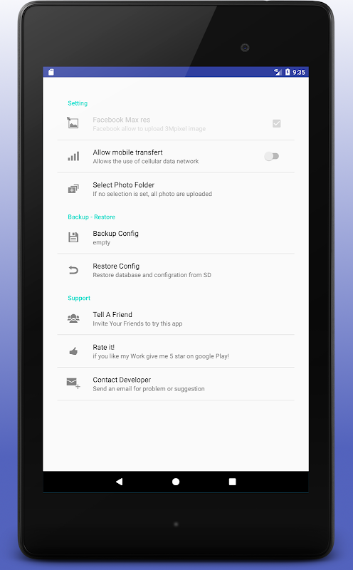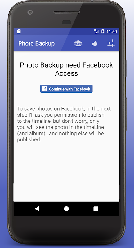 This application allows you to automatically and at any time to upload all your photos in an private album on Facebook and accessible only to you;