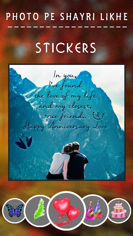 -Photo pe hindi shayari likhna ab easy he. You can write Hindi shayari, good morning, good night, birthday, anniversary etc wishes in Hindi on your photos or on backgrounds given in the app.