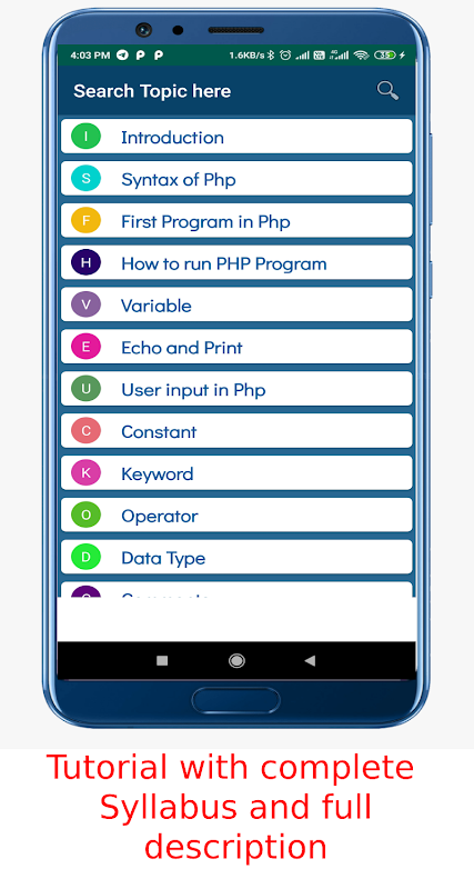 Đây là ứng dụng duy nhất mà bạn có thể học toàn bộ giáo trình ngôn ngữ PHP với Hướng dẫn, chương trình và các câu hỏi và câu trả lời phỏng vấn.