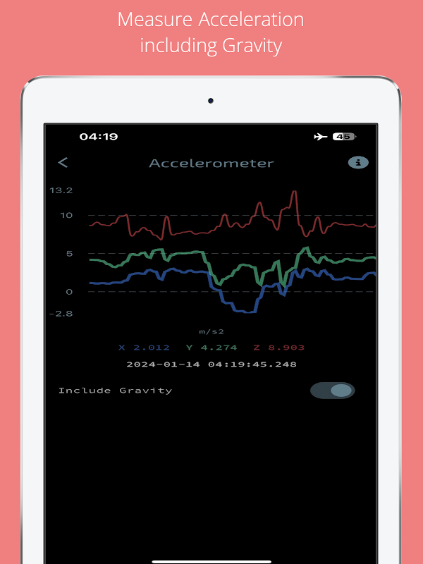 * Gia tốc kế: Đo gia tốc xung quanh thiết bị của bạn. Đầu ra tính bằng m/s2 cho các trục x, y và z. Ngoài ra, bạn có thể loại bỏ trọng lực khỏi các phép đo của mình bằng một cú nhấp chuột và xem gia tốc thực sự.