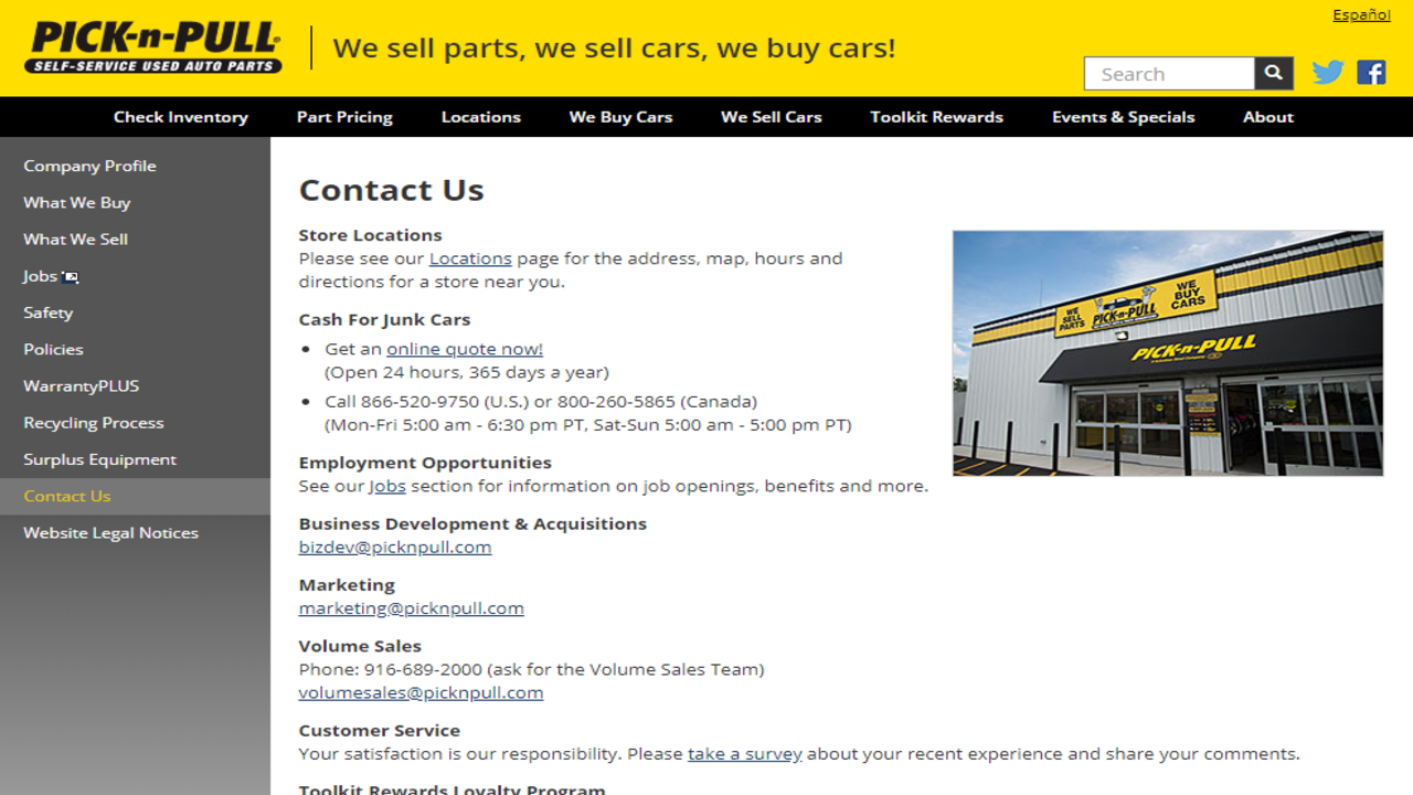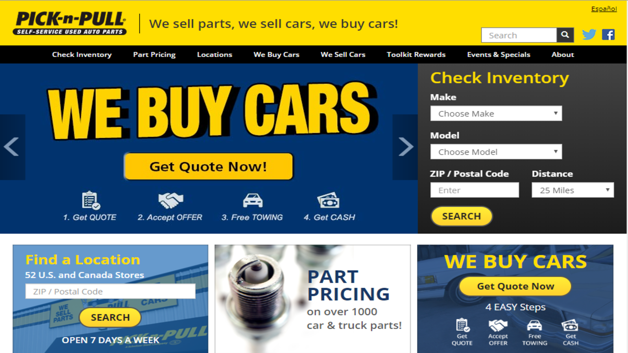 Pick-n-Pull is an industry-leading chain of self-service used auto parts stores providing recycled original equipment manufacturer (OEM) auto parts at incredible prices. For over 30 years, we have been offering quality parts for all makes and models of foreign and domestic cars, vans and light trucks. Our selection of vehicle parts is tough to beat with new arrivals daily and our stores are open 7 days a week! Finally, our shopping experience and excellent customer service set us apart from the traditional junkyard. Drop by and see for yourself.