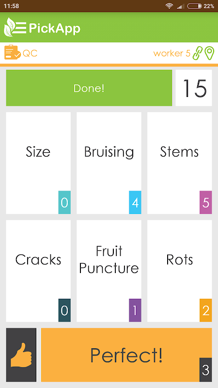 Báo cáo tất cả các hoạt động của trang trại và liên kết từng hành động với một vị trí, thời gian và nhân viên nông trại cụ thể. Dữ liệu được quét sẽ được PickApp tự động tải lên và phân tích theo thời gian thực. Quy trình không lỗi này thay thế báo cáo thủ công không chính xác và giúp chủ trang trại thực thi một phương pháp làm việc ổn định và có cấu trúc dựa trên tính toàn vẹn của dữ liệu hoàn hảo.