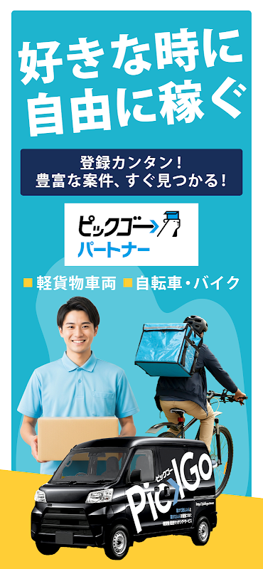 Với PickGo, bạn có thể thực hiện nhiều nhiệm vụ khác nhau vào thời gian riêng của mình. Giao hàng công ty, giao hàng tận nhà, giao đồ ăn. Đề xuất cho người lái xe máy và chở hàng nhẹ tự do! Bạn có thể đăng ký ở bất kỳ đâu trên toàn quốc.