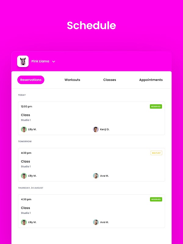 Để các thành viên của Pink Llama giữ chỗ trong lớp học, đăng ký các sự kiện tập thể dục và quản lý tài khoản chung như cập nhật ảnh chân dung và thẻ tín dụng trong hồ sơ.